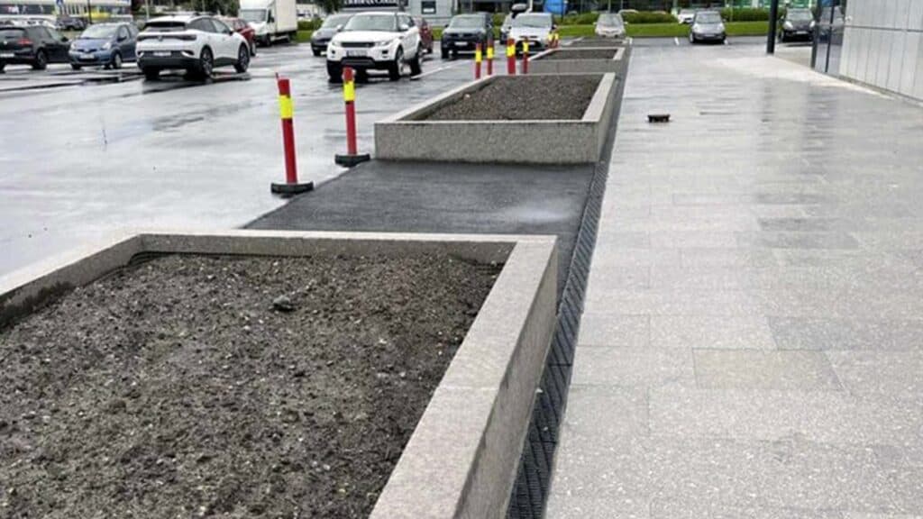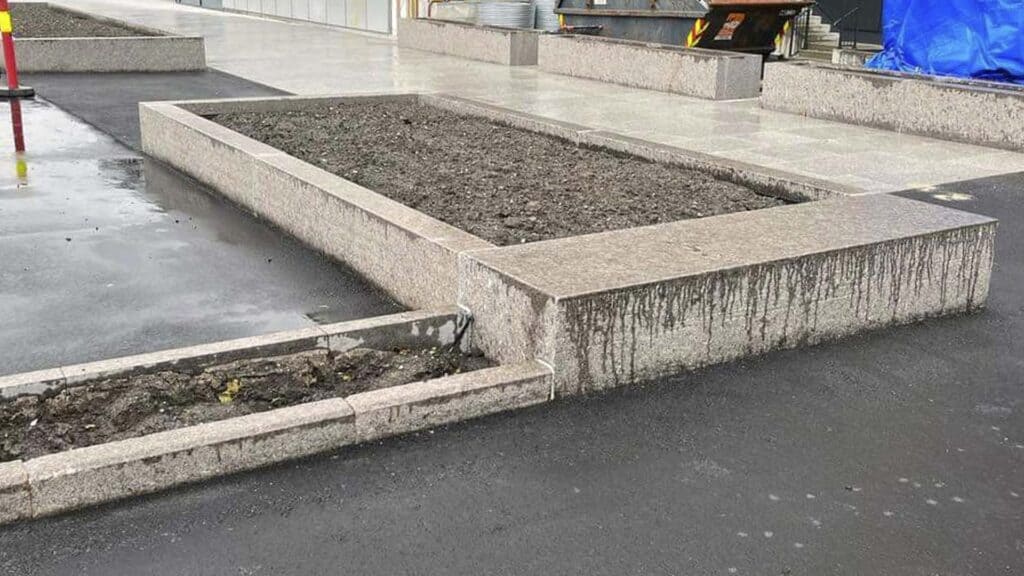 Stein er svært holdbart og tåler værforhold som regn, snø, varme og frost uten å miste strukturell integritet. Stein er naturlig og tidløs som kan passe godt inn i både moderne og tradisjonelle utendørsområder. Steinen har naturlig isolerende egenskaper, som kan beskytte røttene til plantene mot ekstreme temperaturer. Blomsterkassen fungerer som et naturlig skille mellom parkeringen og gåsone.